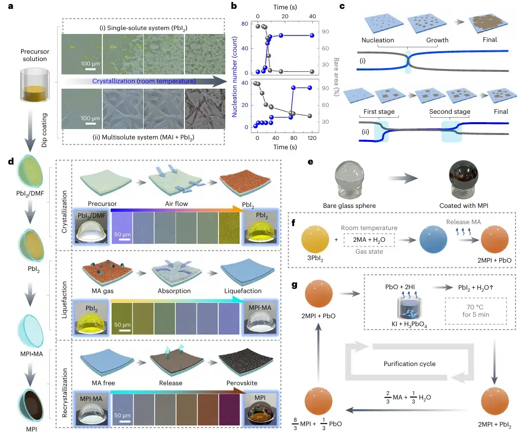 图1:钙钛矿薄膜在不可展基底上的自组装。(a–c)(i)PbI2与(ii)PbI2/MAI钙钛矿前驱体系的光学显微镜图像(a)、成核密度/裸露面积随时间变化(b)及结晶过程示意图(c)。(d)在直径2 cm的半球形石英基底上沉积MPI薄膜的演示;左侧纵向排列的示意图展示沉积四阶段,右侧水平排列的插图为各阶段间连续薄膜变化的光学显微镜观察。(e)涂覆MPI薄膜前后玻璃球对比。(f)开放环境中PbI2与MA气体反应的化学方程式。(g)纯化循环及其对应的化学组成变化。
