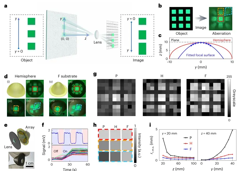 图4:基于单透镜成像系统理论预测的传感器。(a)单透镜成像系统的像差示意图。(b)3×3发光阵列及其经单透镜在平面上的成像;红色、橙色与蓝色虚线分别标示中心、边缘与角落图像。(c)单透镜拟合焦曲面。(d)利用3D打印技术获得的半球形(i)与焦曲面(v)基底照片;(ii)–(iv)、(vi)–(viii)为两种基底上3×3阵列在不同视角下的成像。(e)F器件示意图及实物图。(f)单像素响应信号(上)及扫描模式下交叉阵列响应(下)。(g)P、H与F器件捕获的3×3阵列图像。(h)三种传感器中心(红色)、边缘(橙色)与角落(蓝色)像素的归一化输出强度。(i)不同轴上(z)与轴外(y)位置预测rr.m.s.值的对比。