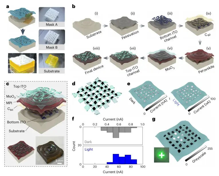图3:在波纹基底上集成光电阵列。(a)波纹基底及其匹配的下层掩模(掩模A)与上层掩模(掩模B)。(b)在波纹曲面集成光电阵列的步骤:(i)–(vii)逐层沉积过程;(viii)最终器件。(c)波纹交叉阵列的分层结构;下方为器件示意图与实物图。(d)波纹交叉阵列的空间分布,每黑点对应单个像素。(e)(f)波纹阵列在平行入射光下的暗信号与光信号分布(e)及对应统计(f)。(g)波纹阵列采集的“+"形光图像。