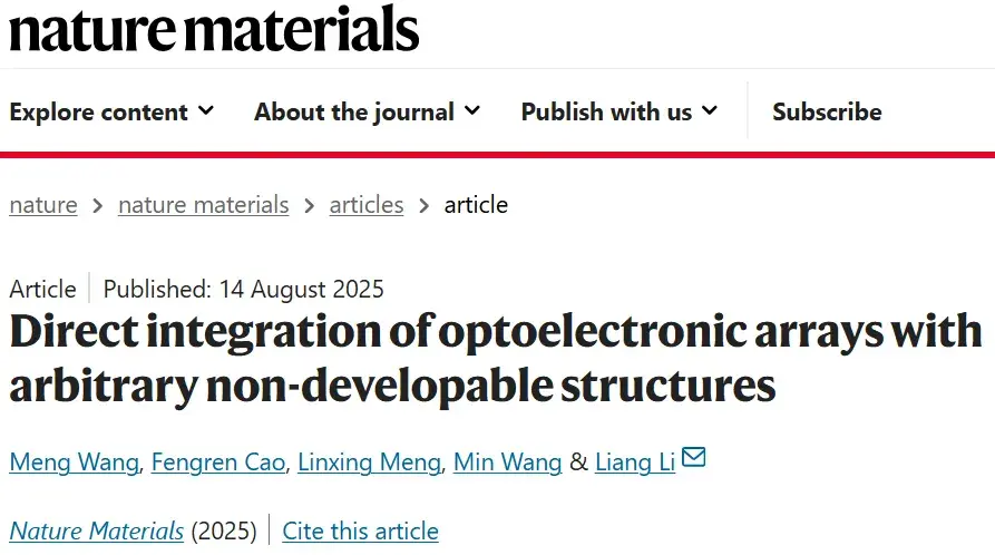 针对以上难题,苏州大学李亮教授团队在《Nature Materials》上发表了题为“Direct integration of optoelectronic arrays with arbitrary non-developable structures"的论文,报道了一种自组装钙钛矿策略,用于将光电阵列直接集成到任意非可展曲面结构上。该策略通过利用碘化铅溶液的低能波动驱动快速成核主导的结晶过程,使流体前驱体凭借表面张力沿非可展基底均匀分散,再通过气体调控自组装成致密薄膜。