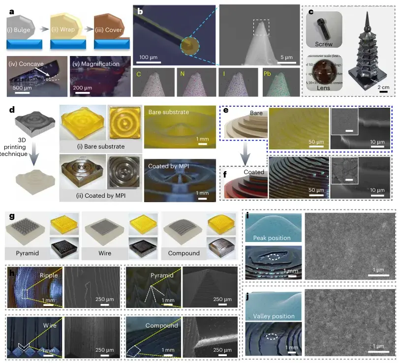 图2:钙钛矿在多种空间结构基底上的沉积。(a)不规则凸起包覆过程示意图;下方为MPI包覆凸起的光学图及凹陷区局部放大图。(b)涂覆MPI的微型探针图像;放大插图为白框区域C、N、I、Pb的能谱面分布结果。(c)螺丝、透镜及中国古代塔模型涂覆MPI后的照片。(d)波纹状模型设计,通过3D打印技术在黄色光敏树脂中实现;右侧为模型涂覆MPI前后对比。(e)(f)裸基底(仅ITO导电层)(e)与包覆的3D打印层状纹理(f)对比;白框内插图标尺100 nm。(g)更多被MPI薄膜包覆的空间结构展示,包括金字塔阵列、线阵列及球面线阵列复合结构。(h)上述模型的光学显微镜(左)与SEM(右)细节图。(i)(j)波纹模型峰位(i)与谷位(j)处钙钛矿形貌图。
