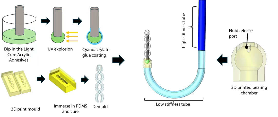 通过采用3D打印工艺精确构建低刚度且可旋转的螺旋柔性导管头部,实现了柔性材料与微尺度结构的有机结合,不仅提升了导管的可控性和安全性,还显著增强了药物与血栓的作用效率及机械血栓破碎能力,为血管介入手术中的微创治疗提供了高效且创新的技术方案,推动了软体医疗机器人在临床中的应用转化。