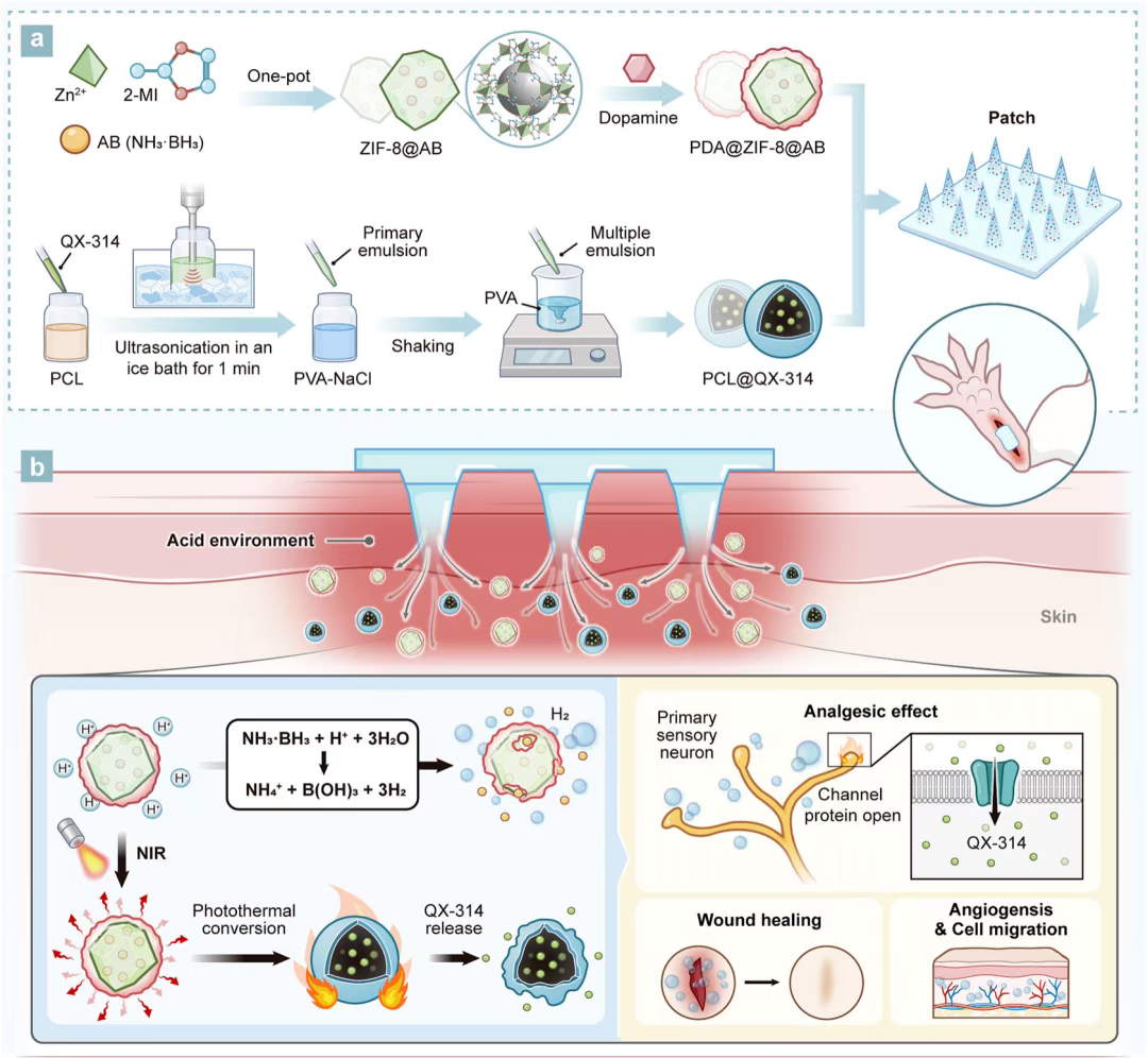 研究团队联合开发了一种新型的光热微针系统,通过持续释放H2来缓解术后疼痛,并促进伤口愈合,为个性化镇痛治疗提供了新的解决方案。