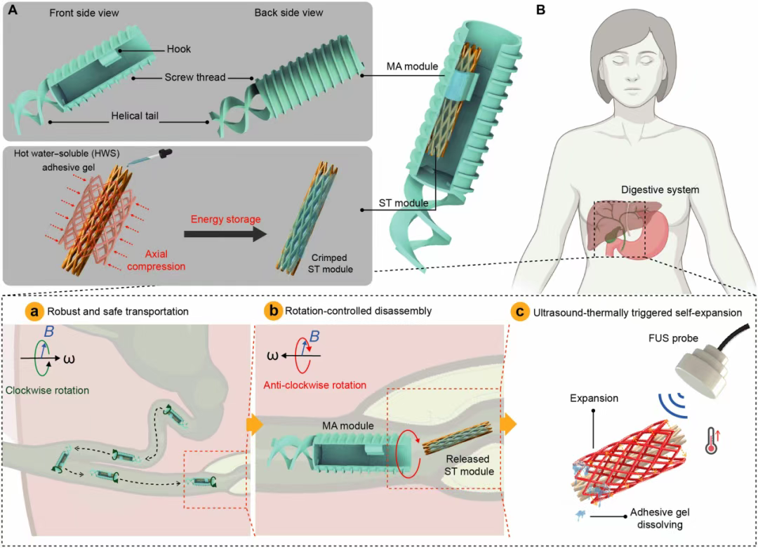 研究团队提出了一种模块化磁控微机器人系统。该系统创新性地将磁驱动模块与超声响应型自膨胀支架模块相结合,通过旋转方向控制实现“集成推进"与“定点分离"两种状态的智能切换,并利用聚焦超声触发支架在病灶处的快速膨胀,实现了在复杂管道内的稳定穿行与支架的按需精准部署。