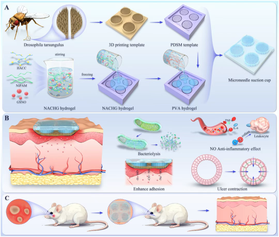 仿生微针贴片针对BIS的独特微环境量身定制,以“湿环境稳定黏附+NO智能可控释放+细菌高效抑制+机械收缩促进愈合"这些性能,促进细菌感染性口炎的高效愈合。