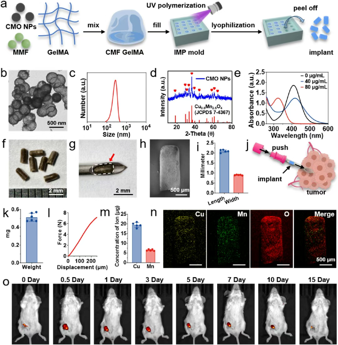研究人员通过水热法合成CMO纳米颗粒,然后冷冻干燥备用。随后加热与CMO纳米颗粒和富马酸单甲基(MMF)混合的GelMA水凝胶,然后将其添加到由摩方精密nanoArch® S130(精度:2μm)3D打印机制备的模具中。该植入剂的设计融合了工程学、材料科学与免疫学原理,通过局部植入触发协同免疫激活,为实体瘤提供了一种高效、安全且具有局部至全身免疫调控能力的治疗新策略。