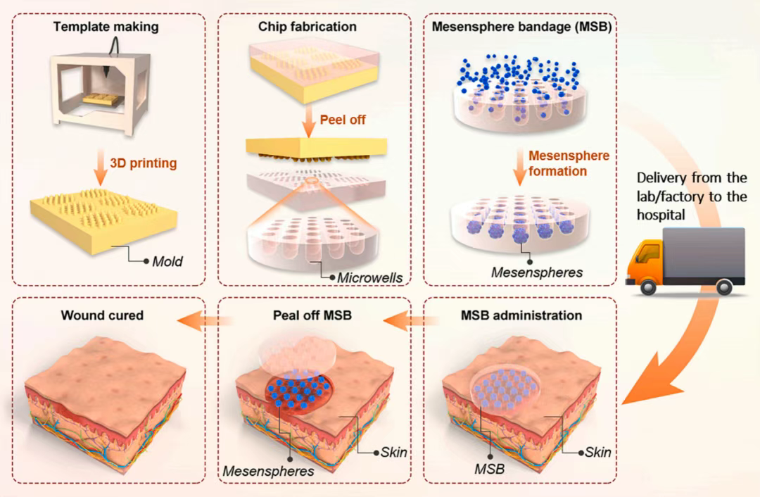 澳门大学贾艳伟副教授团队开发了一种基于间充质干细胞球的创可贴式敷料(MSB),可高通量制备致密均一的间充质干细胞球。