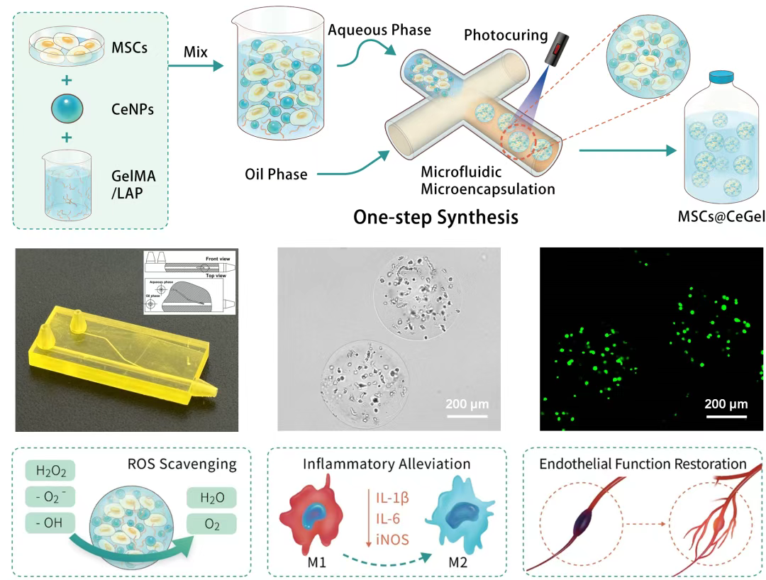 本项研究开发了一个协同治疗平台——负载氧化铈纳米颗粒的甲基丙烯酸明胶(GelMA)的水凝胶微球(CeGel),用于间充质干细胞的递送以治疗血栓闭塞性脉管炎。