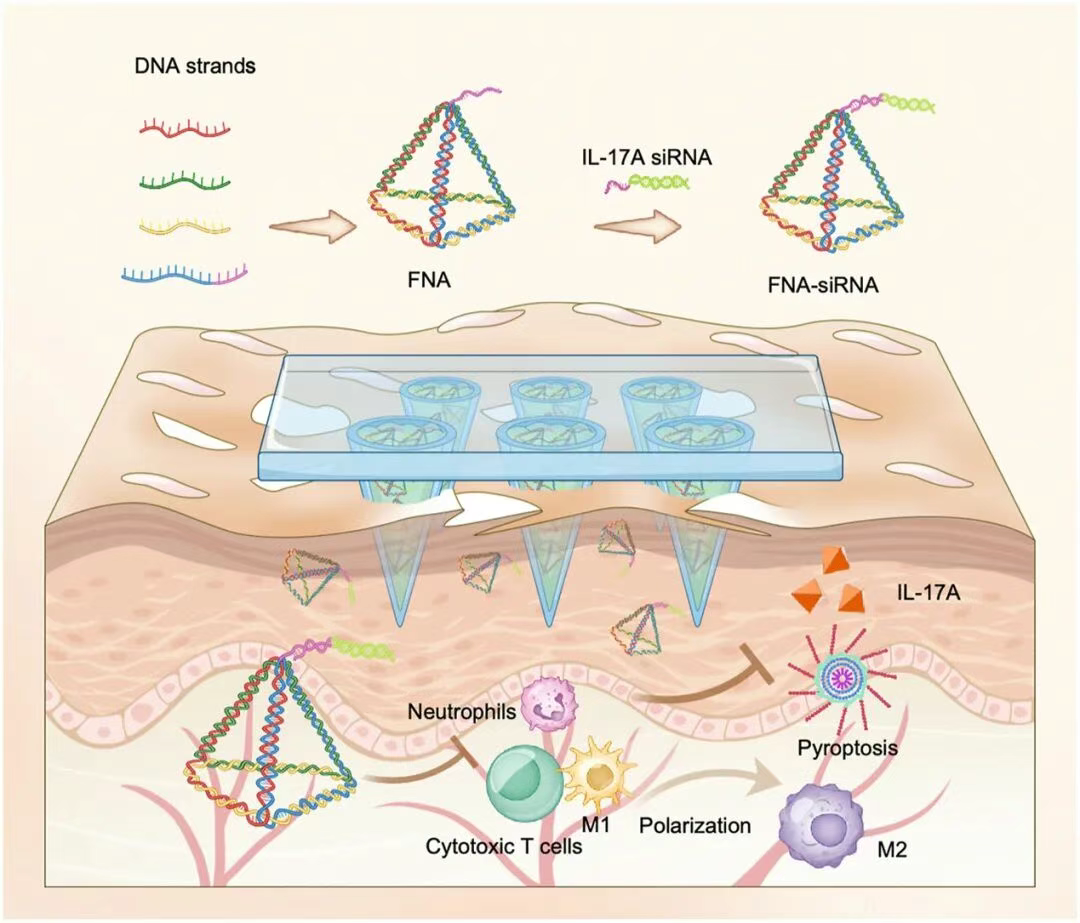 该研究开发了一种基于补偿效应的ROS控制策略。DNA纳米结构在生理环境中比线性核酸分子更稳定,因此制备了DNA纳米结构,并将其整合到微针中。这些纳米结构不仅能够调节ROS水平,还能促进IL-17A siRNA向银屑病病变部位的递送。