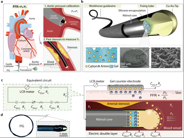研究团队开发了一种新型离电型压力导丝(ITG)。该尖部传感导丝基于廉价且技术成熟的工作导丝制备,利用生物本身的离子传导特性,将生物体作为信号的传输通道,省去了传统导丝中多条信号传输导线,从本质上将导丝的操控性能提升至理想水平。