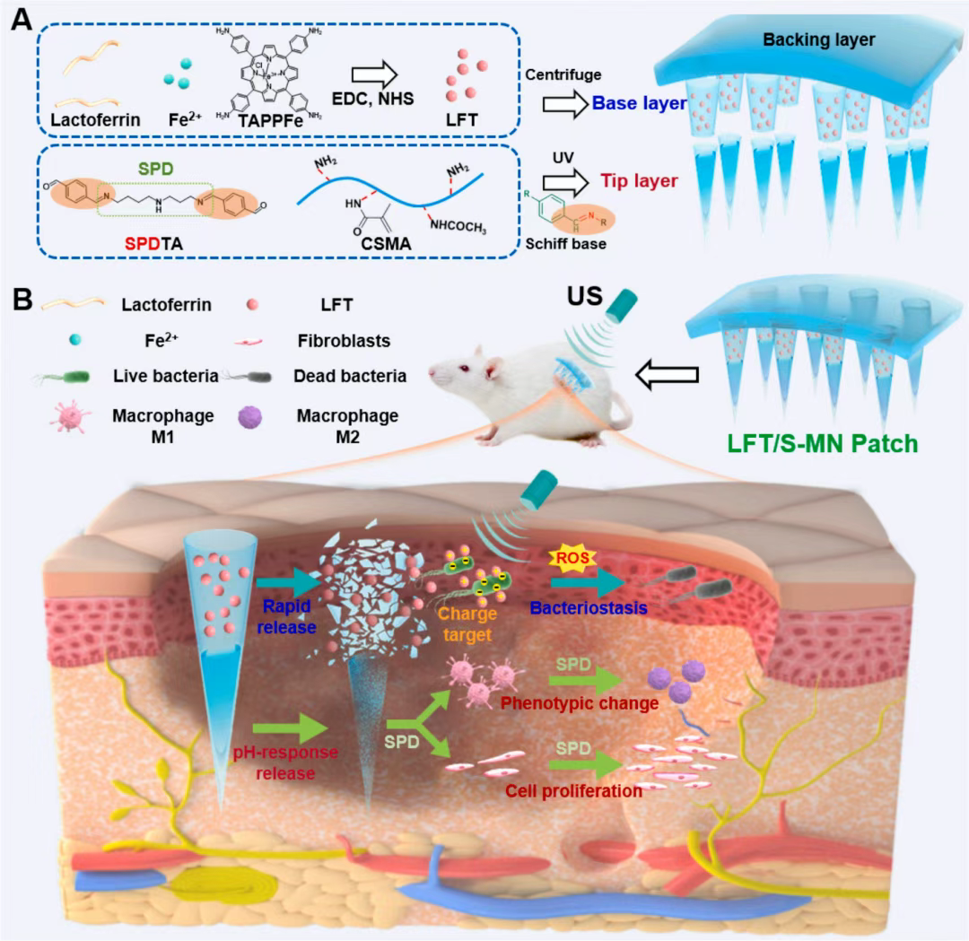 该研究开发了一种pH响应的双层微针贴片(LFT/S-MN),通过整合超声激活的协同抗菌疗法(CDT/SDT)与酸性微环境触发的免疫调节,实现了对感染伤口的高效治疗。