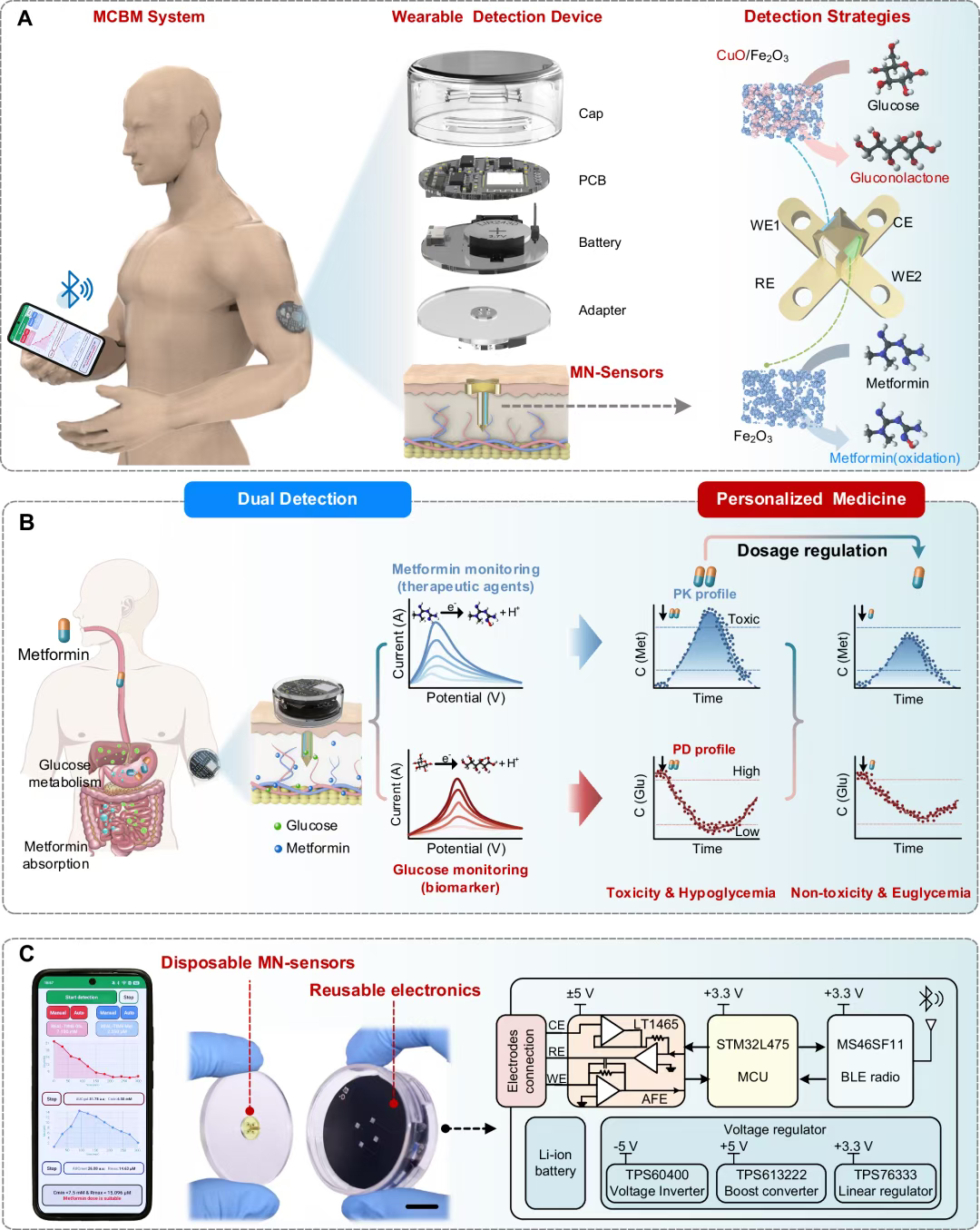 该联合团队开发出一款全新的可穿戴式微针系统(MCBM),突破性地实现了对抗糖尿病药物——二甲双胍及其靶向生物标志物——葡萄糖的同步、连续监测。