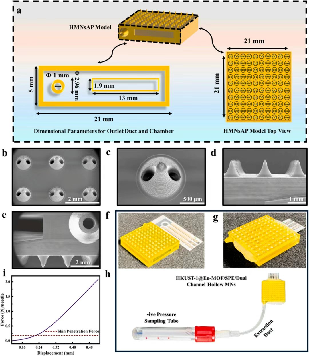 系统核心组件是基于摩方精密nanoArch® S140(精度:10μm)制备的双传感微针,融合纳米酶传感界面与微通道结构,具备优异的检测灵敏度与快速响应能力。这项微针设计不仅显著提升了检测效率,也充分体现了复杂结构3D打印技术在高性能可穿戴医疗设备中的关键价值。