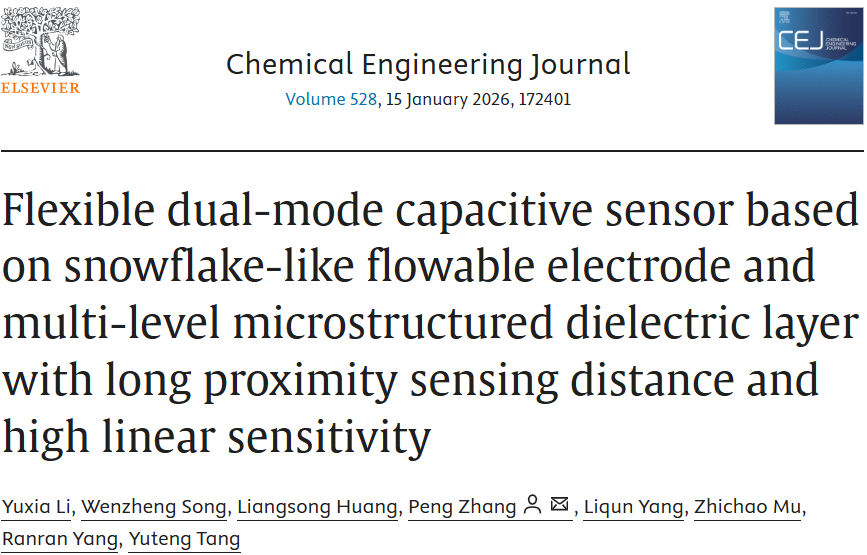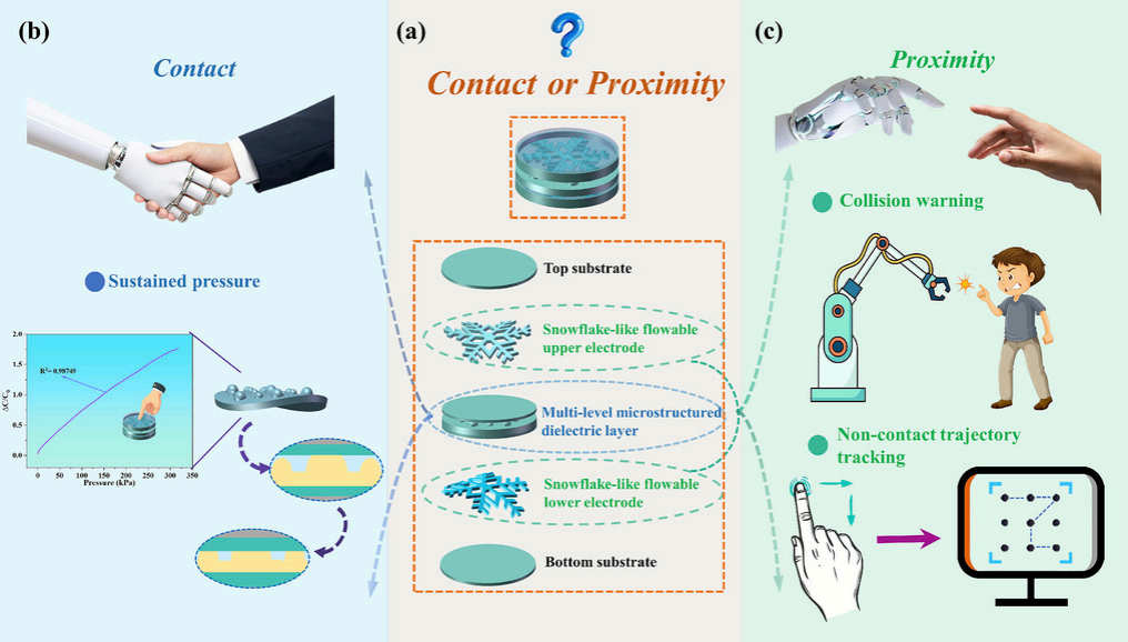 近期,山东科技大学的李玉霞教授在国际期刊《Chemical Engineering Journal》上在线发表题为“Flexible dual-mode capacitive sensor based on snowflake-like flowable electrode and multi-level microstructured dielectric layer with long proximity sensing distance and high linear sensitivity"的原创性论著。该研究利用雪花状电极边缘长度较长的结构优势,有效增强了电极层的边缘电场效应,使接近感知距离提高至100 mm;同时,引入多级半圆体微结构介电层的结构设计,为传感器在触觉感知工作模式下提供了高线性灵敏度(R2=0.98749)及宽检测范围(0-320 kPa)。