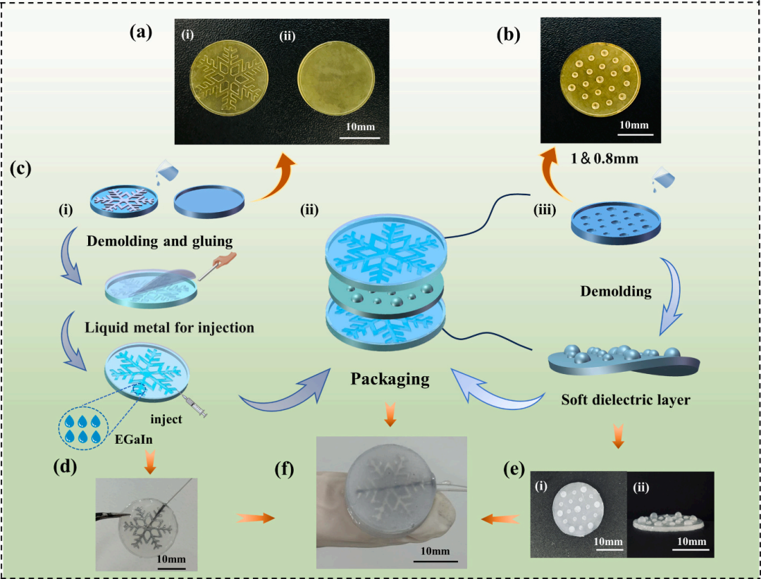 首先,研究团队围绕传感器感知性能的提升开展了创新性的结构设计。如图1所示,所提出的双模态传感器结构整体采用三明治式构型:上下两层为雪花状液态金属电极,中间层为引入多级半圆体微结构的Ecoflex介电层。可流动的雪花状电极为传感器提供了更强的边缘电场效应,使得传感器在安全人机交互、非接触轨迹追踪等领域优势明显;多级半圆体微结构介电层使得传感器具备更均匀的应力分布,在接触感知模式下为传感器提供了高线性灵敏度。