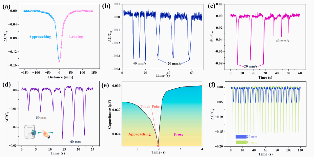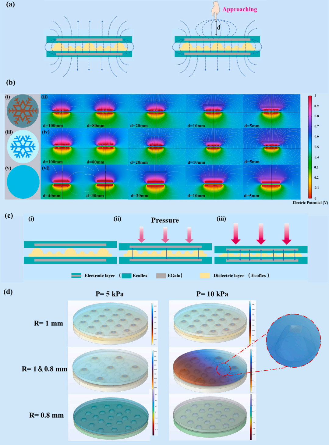 研究团队根据传感器的结构设计,通过仿真对其性能进行系统的分析。首先,对不同电极形状的传感器进行了电场强度仿真,仿真结果如图2a所示。相比传统平行板电极或单分支雪花电极,本文提出的双分支雪花电极在物体接近时电场强度变化更为显著,证实了其更强的边缘电场效应和接近感知能力。同时,分别对单级和多级半圆体微结构的介电层加载压力并进行形变仿真,仿真结果如图2b所示。根据仿真结果分析,半径大的半圆体微结构对较小压力的反馈形变明显,而较小半径的半圆体微结构却对较大的负载压力更加敏感。多级半圆体微结构介电层可同时覆盖高压力和低压力区间,并使介电层在不同压力区间的线性响应特性相互补充,为传感器呈现出了更高的线性度。