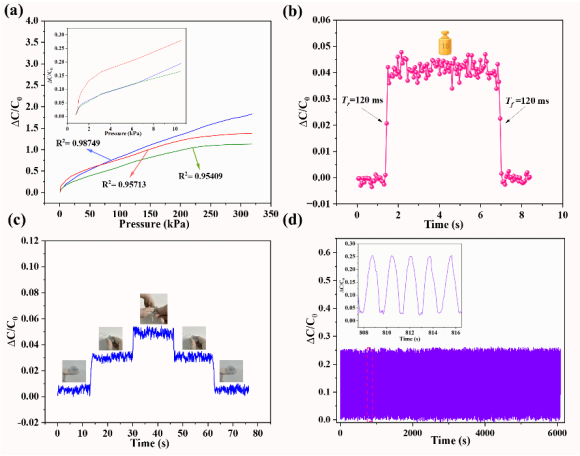 如图4所示,在接近感知模式下,传感器的最远检测距离可达100 mm,且在垂直与水平方向上对不同速度的接近物体均表现出快速且稳定的响应特性。如图5所示,在接触感知模式下,传感器的灵敏度曲线在宽压力范围内保持高度线性。同时,动态加载–卸载测试结果表明,该传感器具有良好的重复性与快速响应能力,其响应时间和恢复时间均约为120 ms。此外,在弯曲与旋转等变形状态下,传感器仍能保持稳定工作,并可实现对低至约0.5 kPa的微小压力的可靠感知。