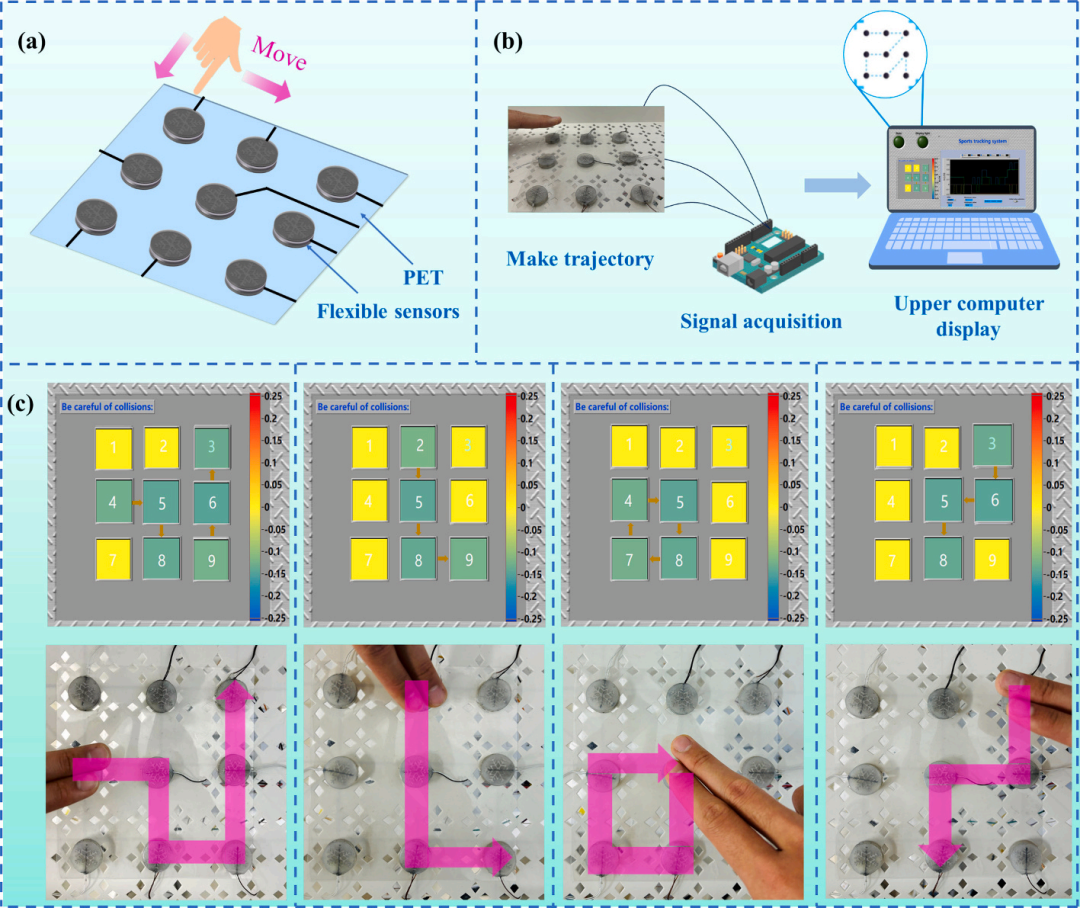 最后,研究团队验证了该传感器在实际场景中的应用潜力。如图6 a-b所示,传感器单元被用于莫尔斯电码加密传输,通过改变按压时长而产生不同电容信号,从而成功解码出“SDUST"字母序列。如图6 c-d所示,将传感器集成于机械臂的肢体与末端,构建了人机协作安全系统。当人手等障碍物接近时,系统能提前感知并触发视觉警报。如图7所示,构建了3×3 传感阵列,成功实现了对手指在阵列上方1 cm处移动轨迹的非接触式实时跟踪,展示了其在手势识别与运动追踪领域的应用前景。